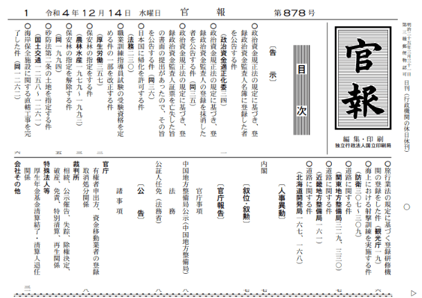 日本国の重要事項や、法律で官報公告が義務付けられている手続きなどが載っています。